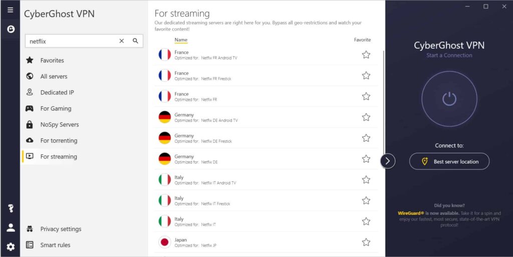 CyberGhost viste seg å være et godt valg for Netflix da jeg testet det. Appen har egne servere merket for streaming, noe som gjorde det enkelt å finne en tilkobling som fungerte med amerikansk Netflix. Jeg likte spesielt at jeg kunne koble meg til på smart-TV uten å måtte fikle med manuelle innstillinger. Hastigheten var jevn nok til at jeg kunne se filmer i HD uten buffering, og prisen er lavere enn mange konkurrenter. Det føltes trygt å ha 45 dagers garanti i bakhånd, siden det ga god tid til å prøve tjenesten i praksis.
