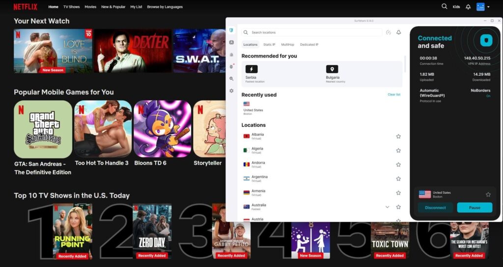 Surfshark overrasket meg positivt da jeg testet den med Netflix. Det første jeg la merke til var at jeg kunne bruke ubegrenset antall enheter på samme konto, noe som gjorde at både jeg og resten av familien kunne se forskjellige kataloger samtidig. Jeg koblet meg til en server i Canada og fikk tilgang til titler jeg ikke fant i Norge, og opplevelsen var stabil hele veien. Prisnivået er også lavere enn mange konkurrenter, noe som gjør Surfshark til et attraktivt valg hvis man vil ha en rimelig Netflix VPN.