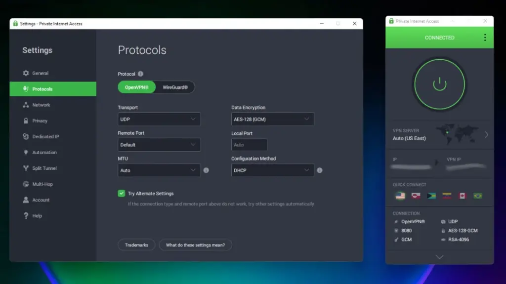 Androids åpne natur gjør at PIA kan tilby flere desktop-lignende funksjoner i mobilappen, inkludert full WireGuard- og OpenVPN-støtte, konfigurerbar kill switch og MACE-annonseblokker.