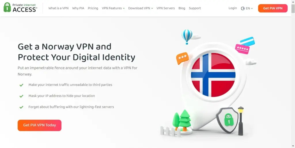 PIA har servere i Oslo, Norge, og over 90 andre land verden over. Dette gir norske brukere muligheten til å koble til en lokal server for best mulig hastighet og lavest latens.