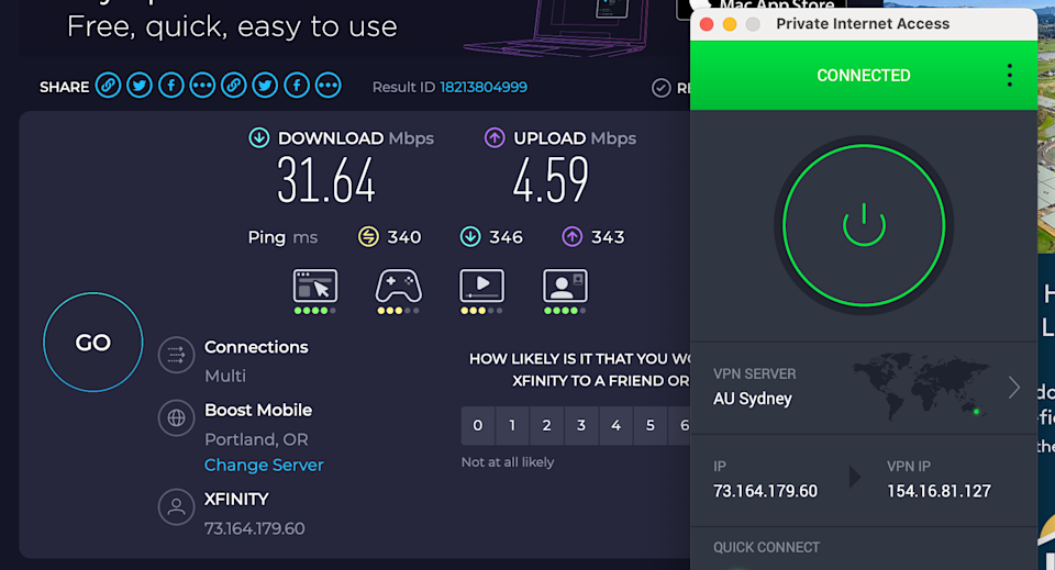 På en baselineforbindelse på 500 Mbps leverte PIA konsekvent hastigheter i området 400 til 450 Mbps på lokale servere. For gaming holder latensen seg lav; ping steg bare fra 25 ms baseline til rundt 35 til 40 ms, med lite hastighetstap.