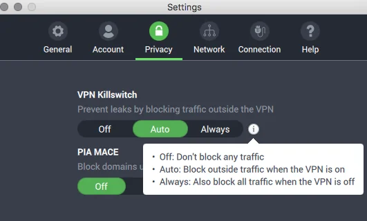 PIAs kill switch fungerer på systemnivå, ikke bare på appnivå. Dette betyr at selv om VPN-appen krasjer, vil all internetttrafikk blokkeres til forbindelsen er gjenopprettet. I våre tester fungerte dette pålitelig hver gang. Andre sikkerhetsfunksjoner inkluderer: