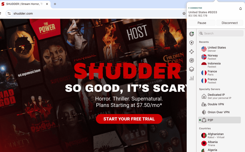 Tilgang til Shudder i Norge er kun mulig med en VPN koblet til en server i USA, Canada eller Storbritannia